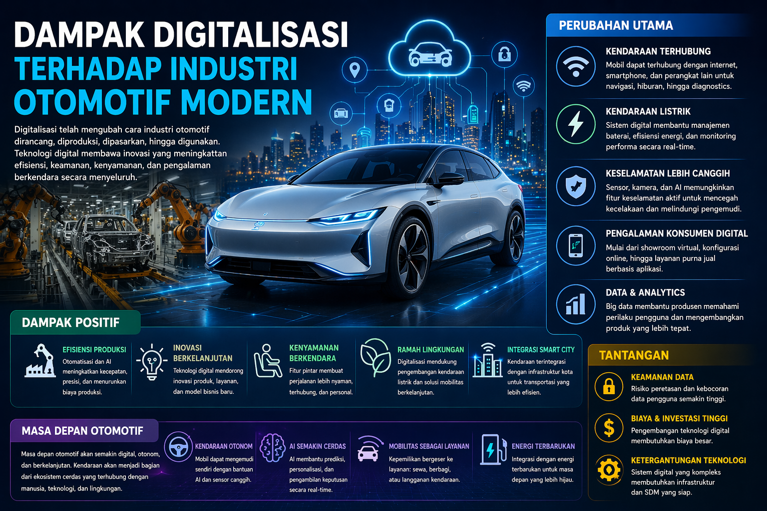 Digitalisasi telah mengubah industri otomotif secara menyeluruh, mulai dari produksi hingga pengalaman pengguna. Kendaraan tidak lagi sekadar alat transportasi, tetapi menjadi perangkat pintar yang terhubung dengan dunia digital. Bagi konsumen, ini berarti kenyamanan, keamanan, dan efisiensi yang lebih baik dalam berkendara.