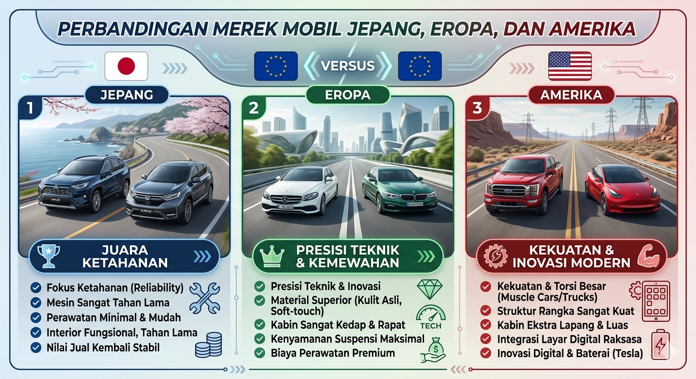 Memilih mobil sering kali bermuara pada perdebatan klasik: apakah Anda memprioritaskan ketangguhan mesin, kecanggihan teknologi, atau kenyamanan berkendara? Secara historis, merek mobil dari Jepang, Eropa, dan Amerika memiliki filosofi desain dan teknik yang sangat berbeda.