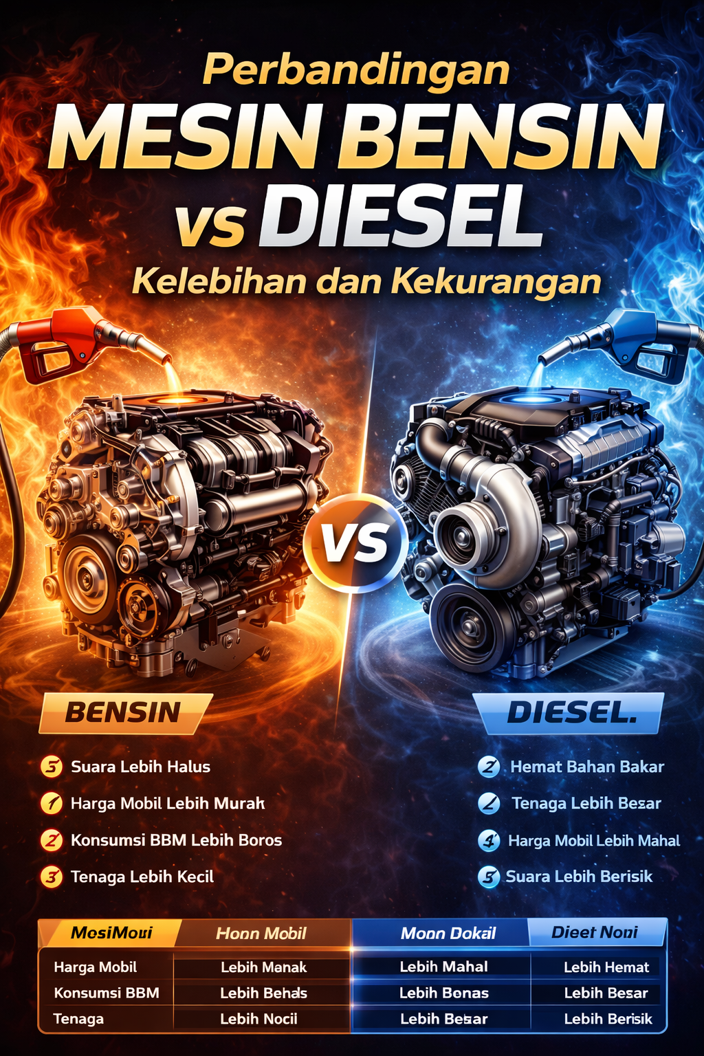 Dalam dunia otomotif, pemilihan jenis mesin menjadi salah satu faktor penting sebelum membeli kendaraan. Dua jenis mesin yang paling umum digunakan adalah mesin bensin dan mesin diesel. Keduanya memiliki karakteristik, kelebihan, serta kekurangan masing-masing yang perlu dipertimbangkan sesuai kebutuhan pengguna.