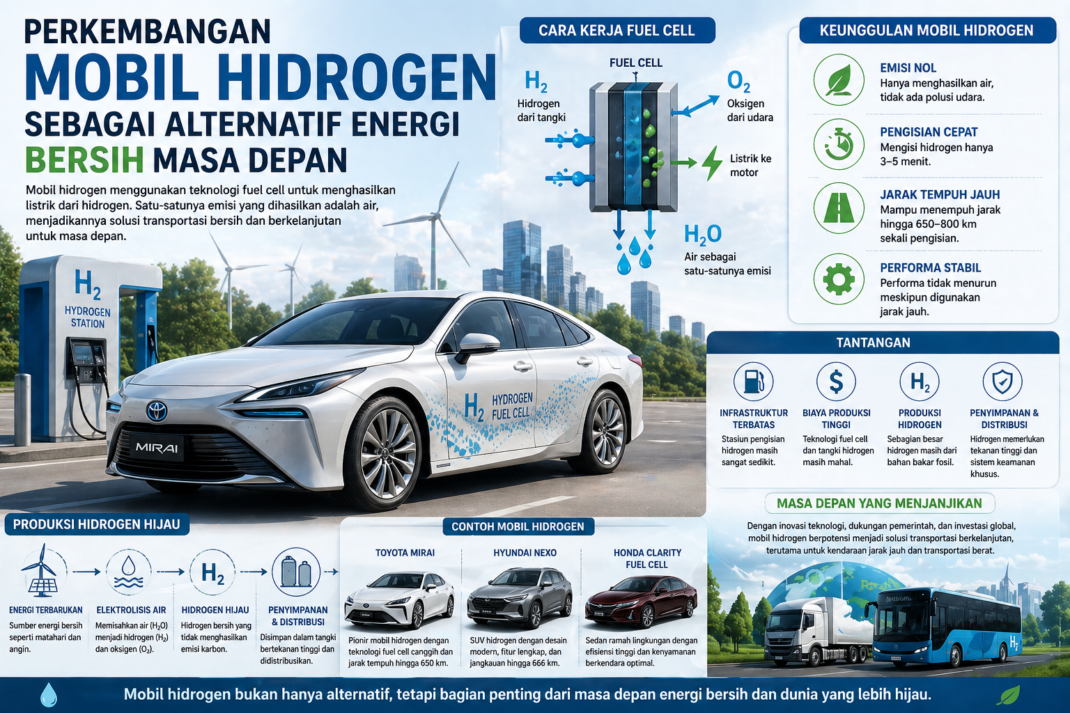 Meski masih menghadapi berbagai tantangan, perkembangan teknologi dan investasi global menunjukkan bahwa mobil hidrogen memiliki masa depan cerah sebagai bagian dari transformasi menuju transportasi berkelanjutan.