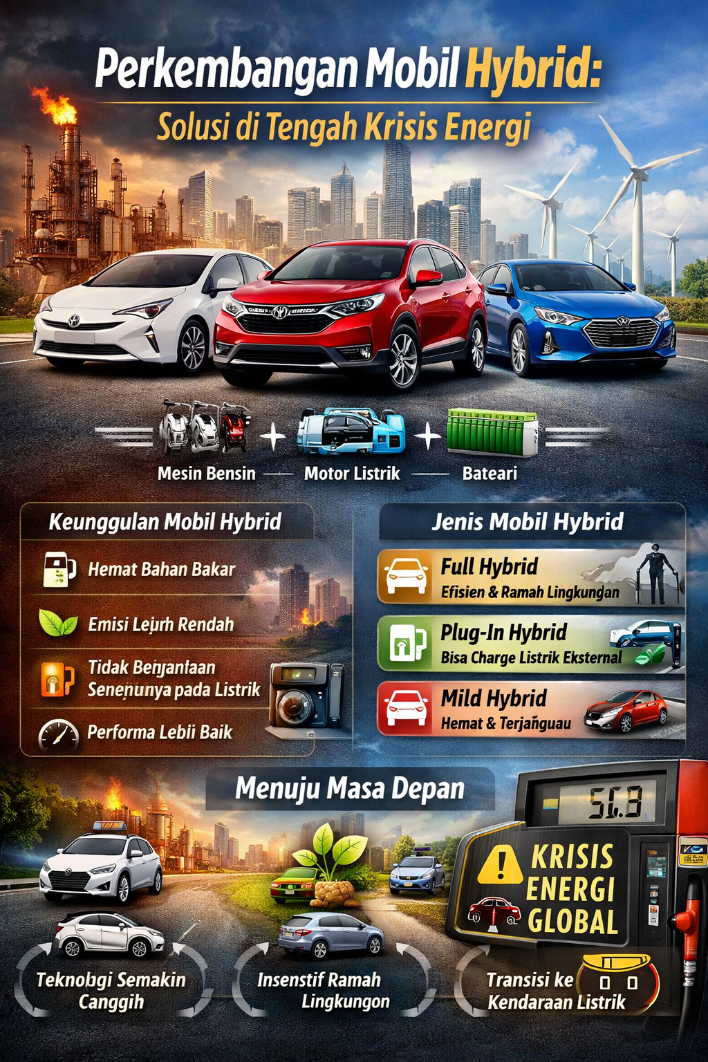 Perkembangan mobil hybrid menunjukkan bahwa teknologi otomotif terus beradaptasi dengan tantangan krisis energi global. Dengan efisiensi bahan bakar yang lebih baik, emisi lebih rendah, dan teknologi yang semakin canggih, mobil hybrid menjadi solusi ideal di tengah kebutuhan energi yang semakin meningkat.