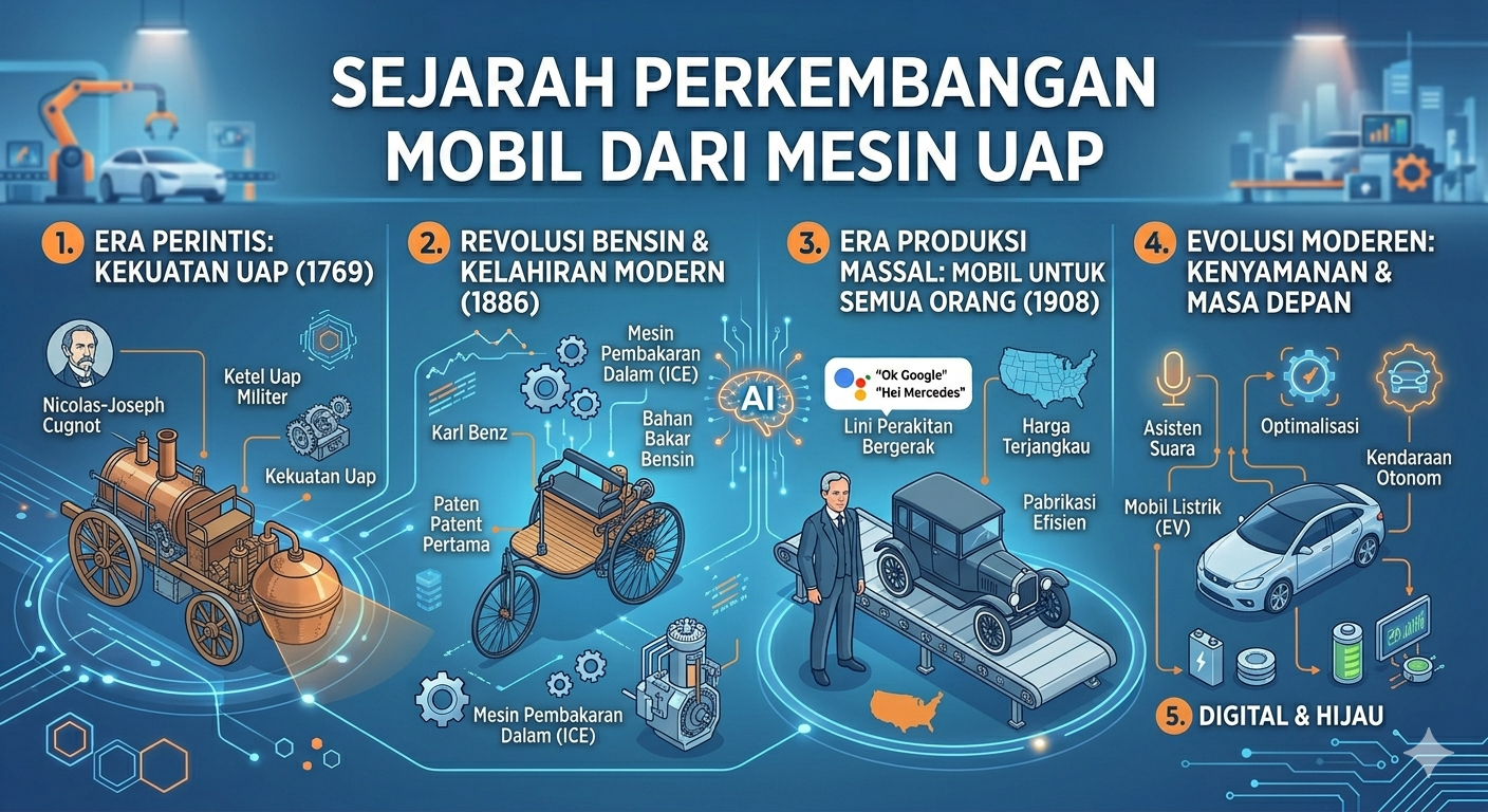 Mobil saat ini adalah bagian tak terpisahkan dari kehidupan modern. Kita menggunakannya untuk bekerja, berlibur, dan mengangkut barang. Namun, kendaraan yang kita kendarai hari ini—yang senyap, cepat, dan pintar—adalah hasil dari evolusi panjang selama lebih dari dua abad. Perjalanan ini dimulai bukan dengan bensin, melainkan dengan kekuatan uap yang menderu.