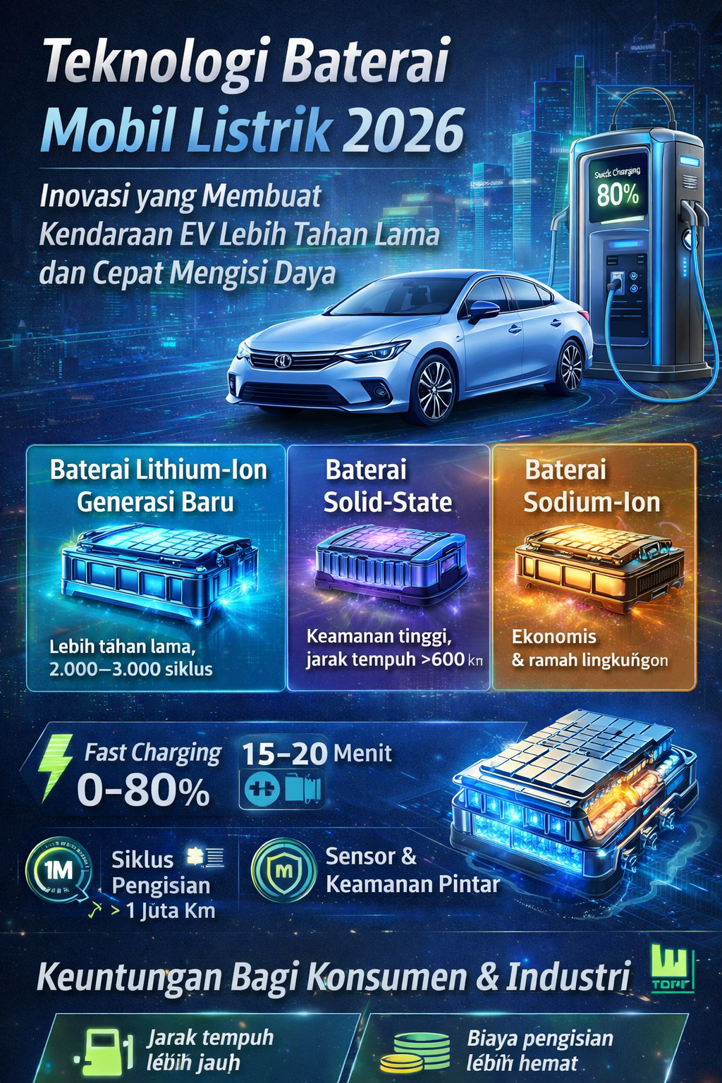 - Bagi Konsumen: Jarak tempuh lebih jauh, waktu pengisian lebih cepat, dan biaya per kilometer lebih rendah.