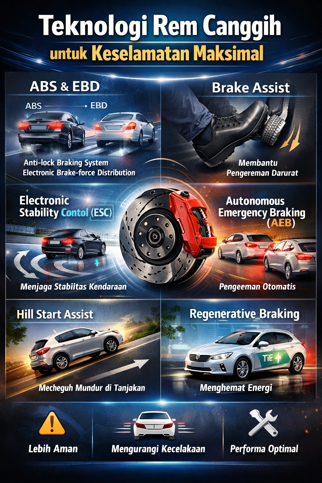 Teknologi rem canggih memainkan peran penting dalam meningkatkan keselamatan berkendara. Fitur seperti ABS, EBD, Brake Assist, ESC, dan AEB membantu pengemudi menghindari kecelakaan dan menjaga stabilitas kendaraan dalam berbagai kondisi.