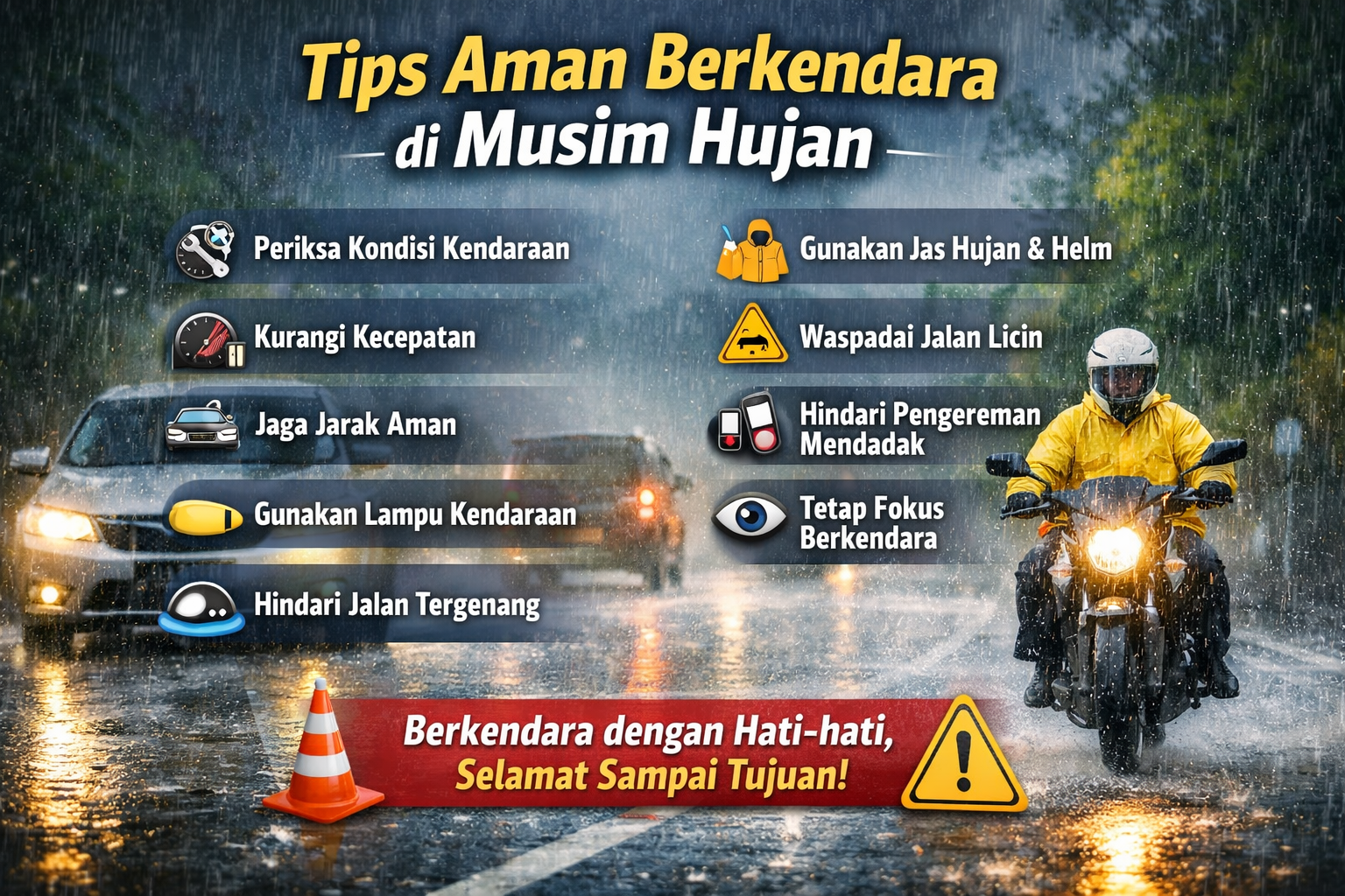 Pastikan kendaraan dalam kondisi baik, kurangi kecepatan, jaga jarak aman, dan gunakan perlengkapan yang sesuai. Selain itu, selalu waspada terhadap kondisi jalan dan hindari genangan air yang berpotensi berbahaya.