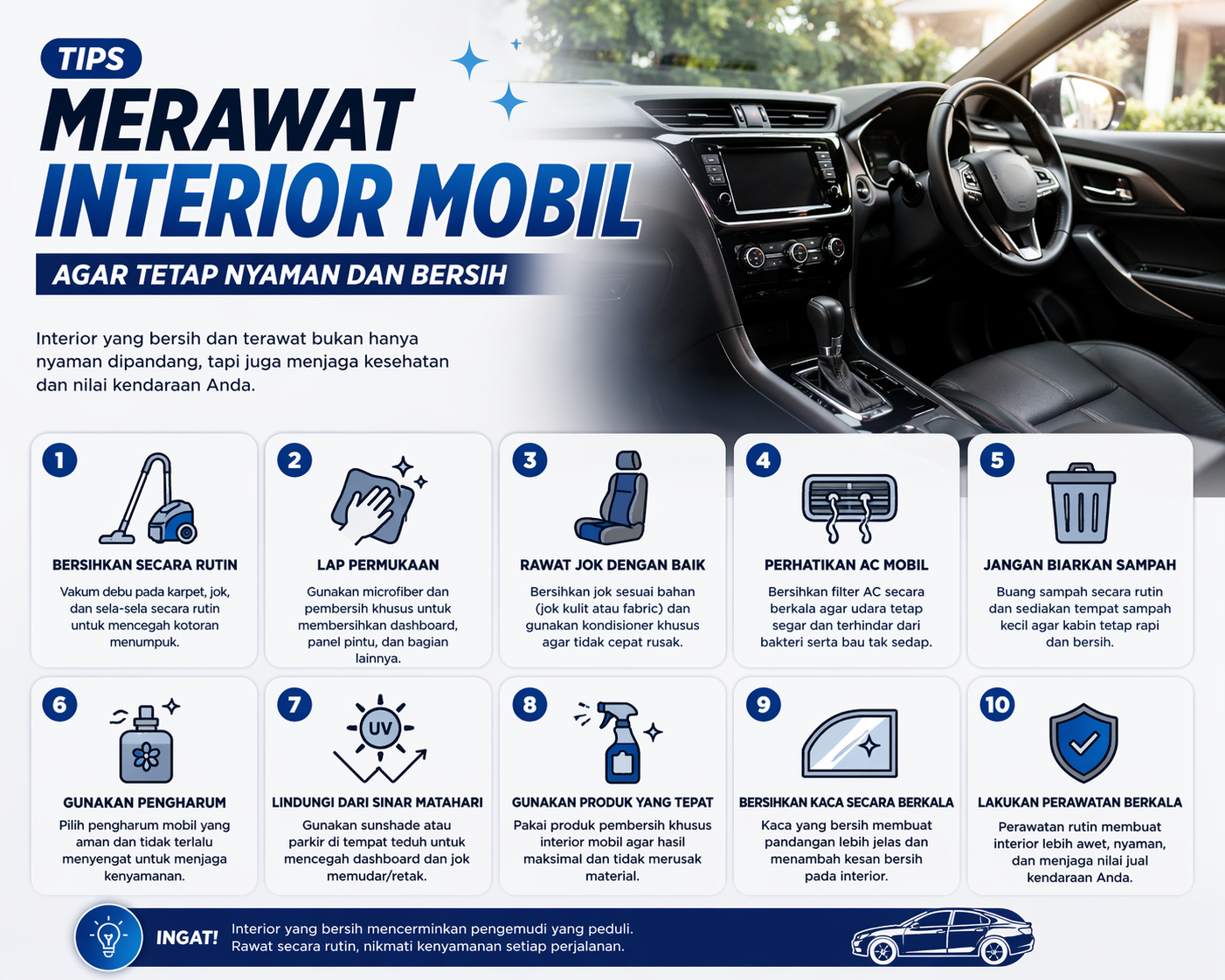 Merawat interior mobil tidak harus mahal atau selalu ke salon mobil. Dengan kebiasaan sederhana dan perawatan rutin, kabin mobil bisa tetap bersih, nyaman, dan awet dalam jangka panjang.